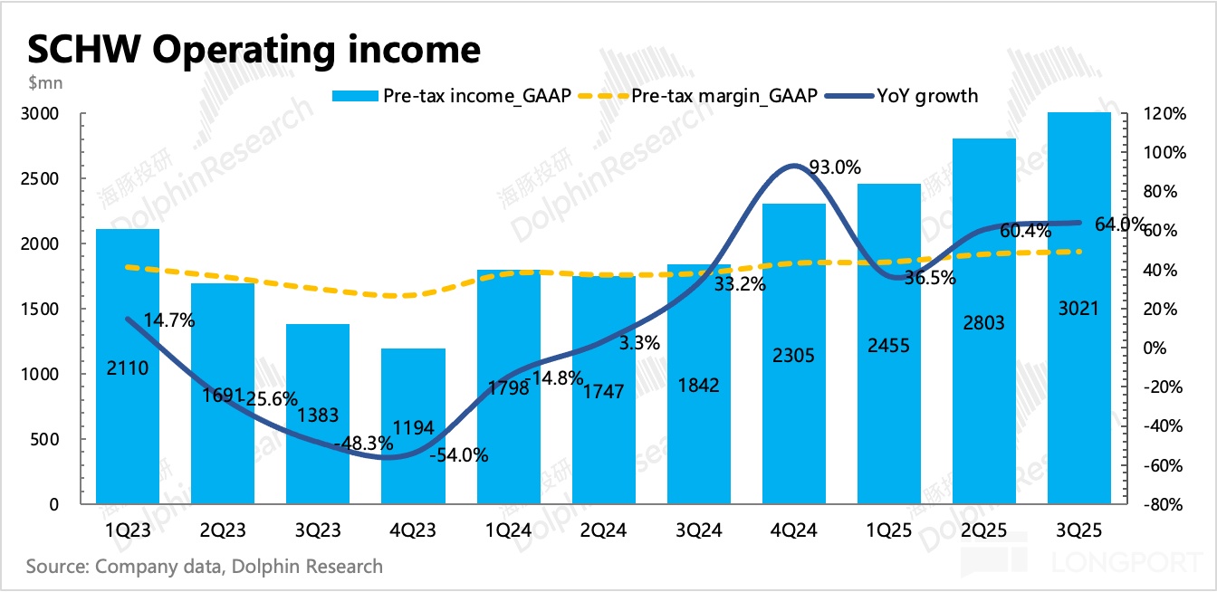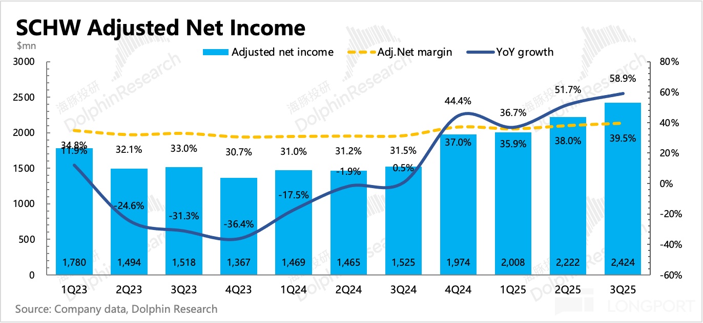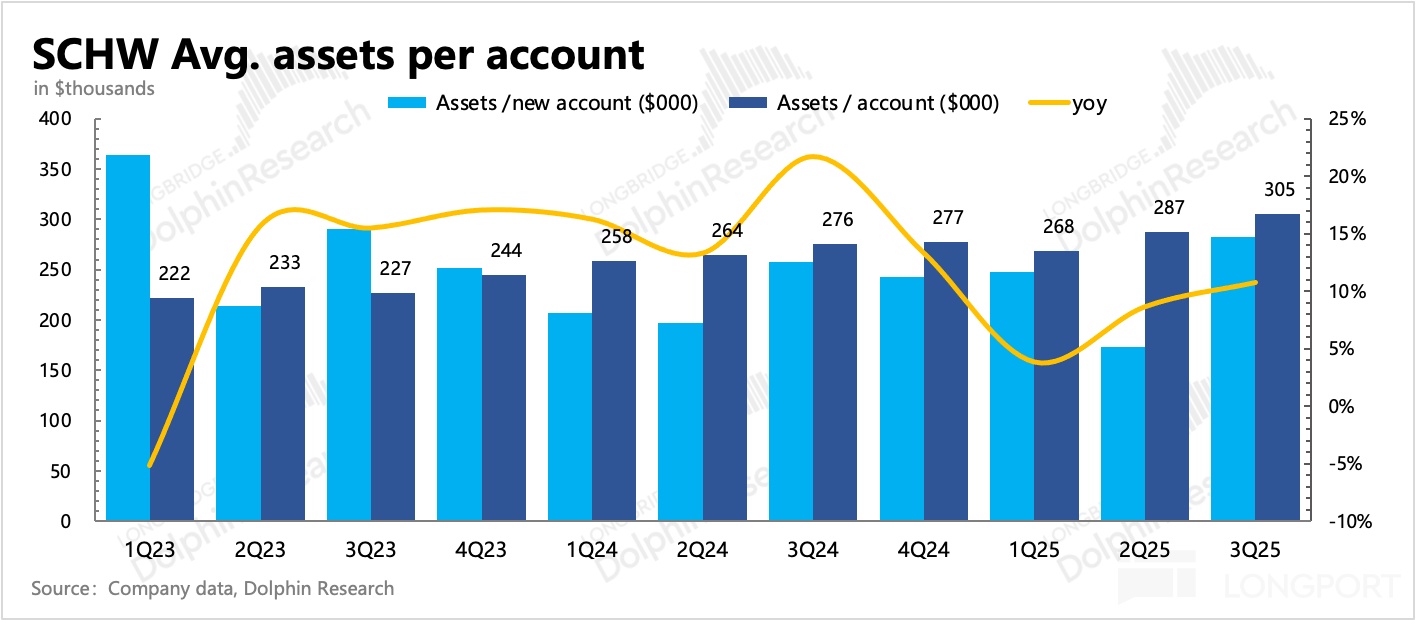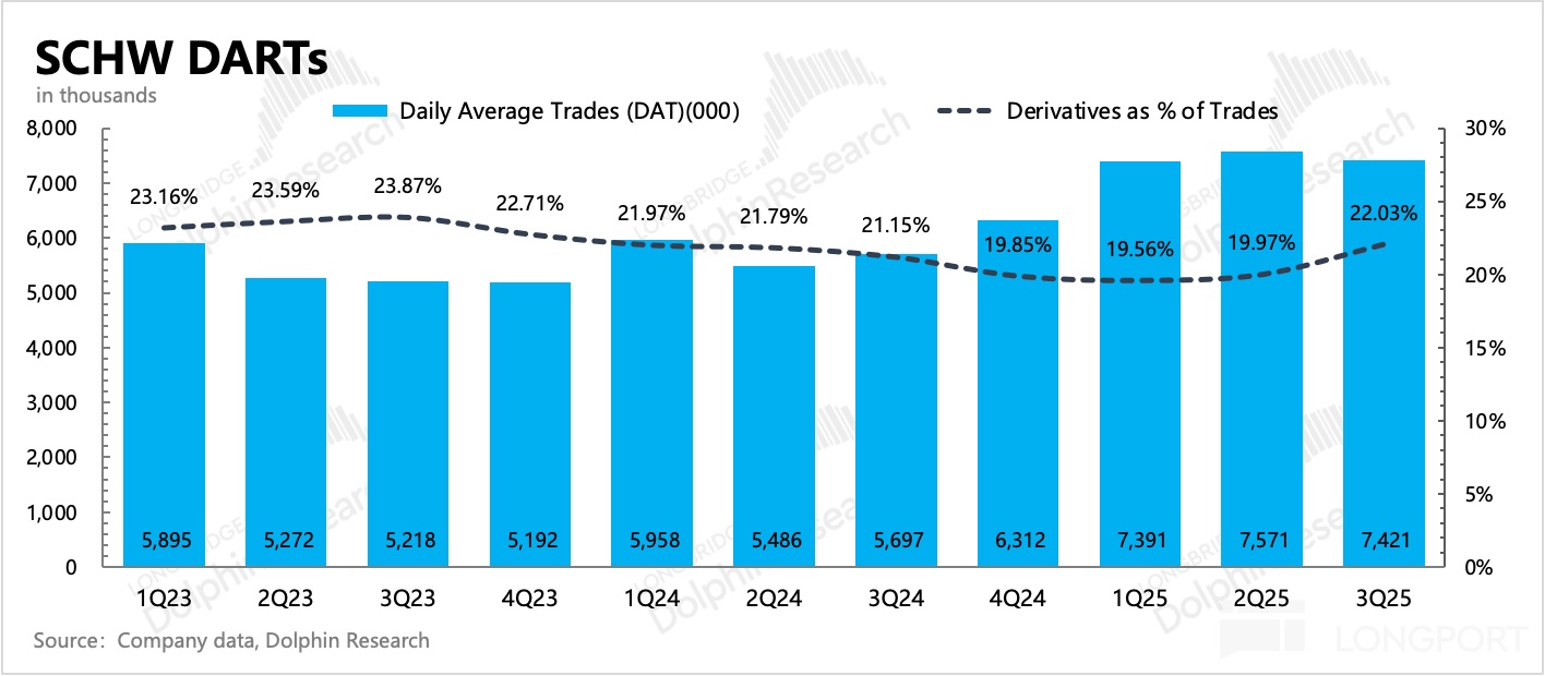 在这样的外部环境下,嘉信交易收入三季度同比增长 25%,较二季度的 22% 进一步加速。其中日均交易笔数 742 万,同比增长 30%。按三季度的情况年化一下,平均每个账户一年交易 49.3 次,同比提高 24%。