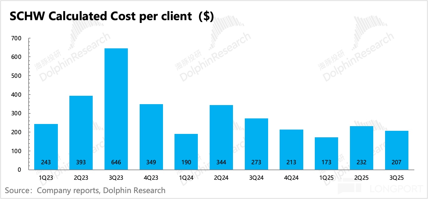 保持这样的增长,嘉信的营销费用也相对稳定。综合计算下人均获客成本 207 美元,基本围绕在 200 美元/人的中枢水平波动。由此可见,尽管外部竞争持续增强,但至少在目前的核心用户群体上,嘉信的品牌心智还是比较坚实的。