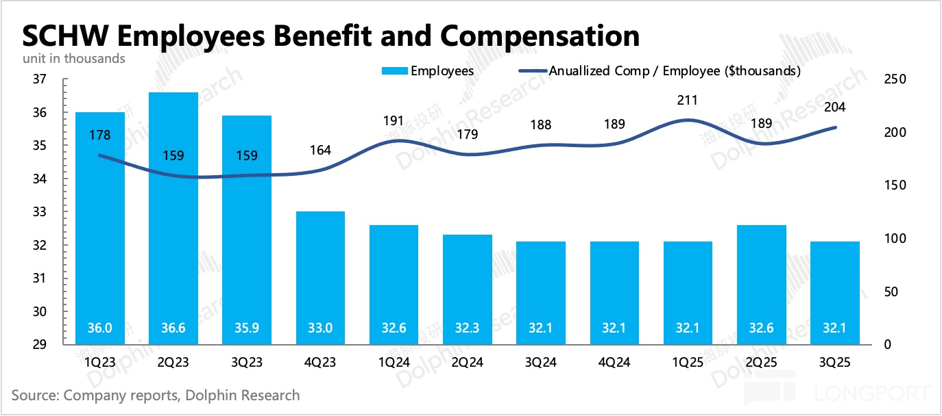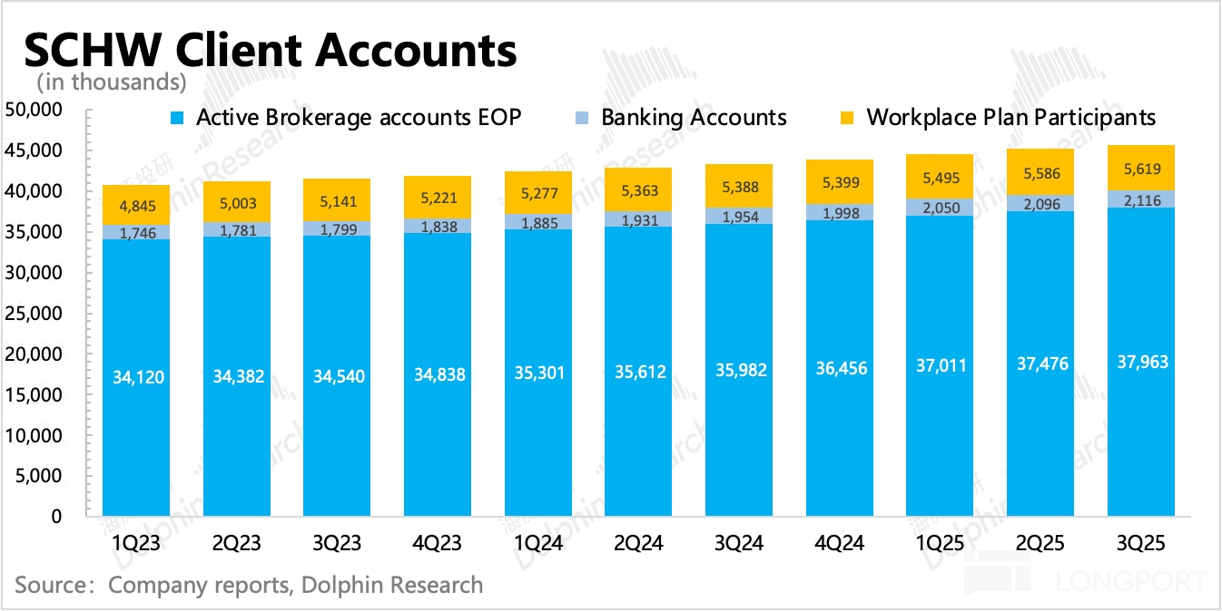 不过,三季度嘉信在新的产品上暂无特别大的动作,主要围绕另类投资平台、员工股权激励管理方案等。除此之外,就是增设网点和团队(已增 16 个,另计划扩建 25 个,同时员工扩招 400 人),来做更多地区的用户渗透。嘉信电话会上管理层会针对业务展望的阐述较多,建议投资者重点关注,海豚君稍后也会第一时间发布在社区和交流群。