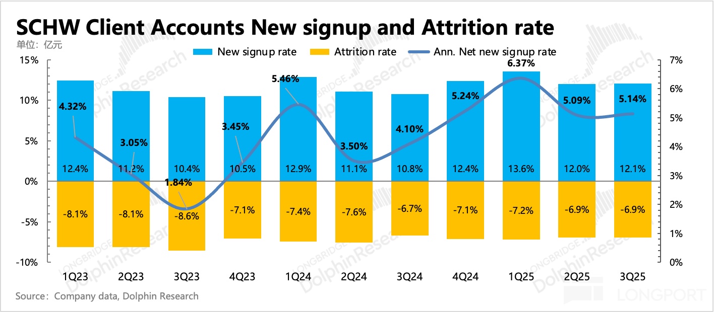(1)经纪账户数毛增 114 万,剔除不活跃的 66 万,净增 49 万。年化来看,相当于 12% 的毛增,7% 的流失,最终 5% 的净增。从过往一年周期看,相对稳定。