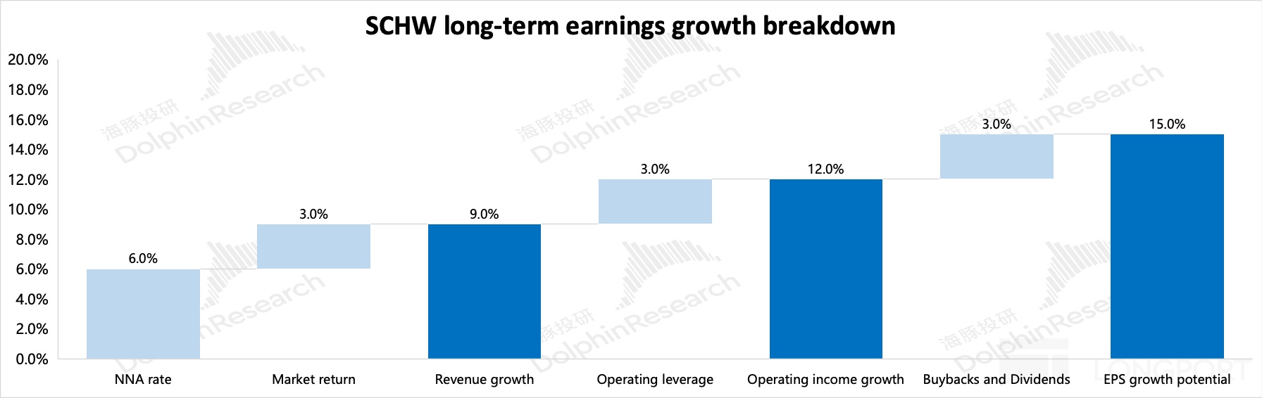 当然,从长期来看核心驱动还是第一点,即NNA 的提升最关键。其次才是看规模效应对嘉信的成本优化、现金管理以及股东回报的变化。如下图展示海豚君对嘉信长期增长的驱动力做了拆分: