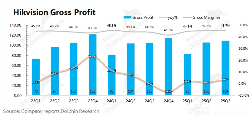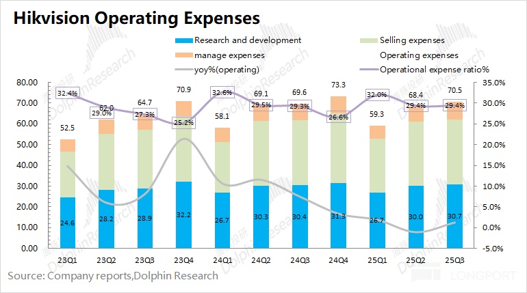 2.毛利及费用端:海康威视 2025 年第三季度的毛利率 45.7%,同比提升 1.5pct,主要来自于硬件端毛利率的提升和创新业务占比提升的带动。