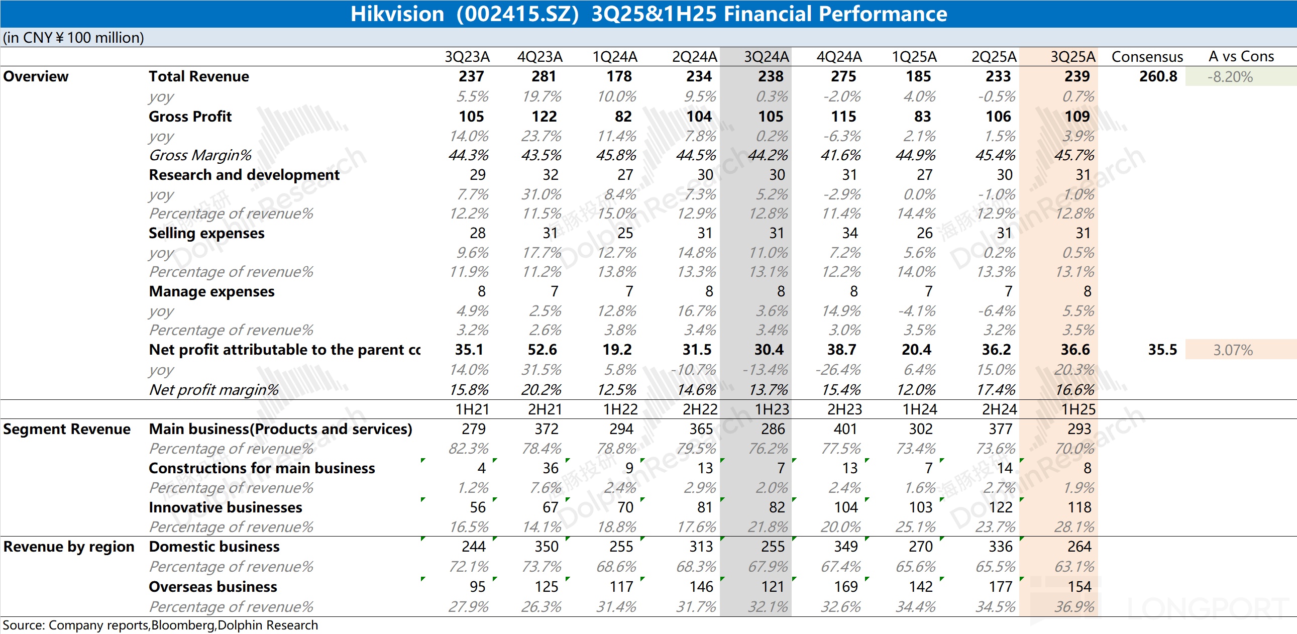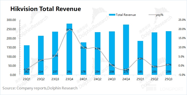 1.收入端:海康威视 2025 年第三季度实现营收 239 亿元,同比微增 0.7%。公司当前经营面仍相对低迷,营收端已经连续 5 个季度未见明显增长。