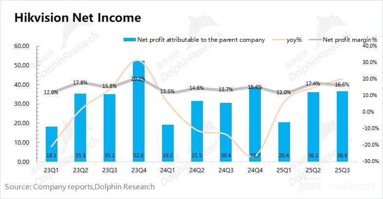 3.利润端:海康威视 2025 年第三季度实现利润 36.6 亿元,同比增长 20.3%,其中公司本季度净利率为 16.6%,同比提升 2.9pct。公司利润端的同比增长,主要得益于毛利率的提升,当前回到 45% 上方。而营收端依然平淡,费用端保持相对平稳,公司当前国内传统领域等相关市场的需求依然是低迷的。