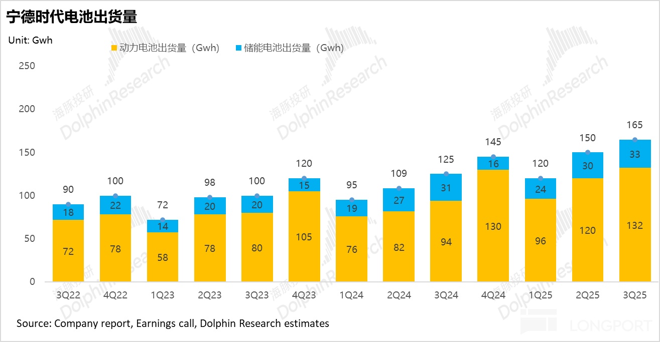 按公司交流,三季度公司电池出货量 180 GWh;动力占比 80%、储能占 20%;其中确认收入口径是 165Gwh,表现基本在预期之中。