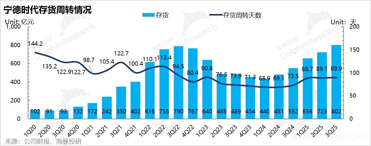 本季度存货直接站上了 802 亿元,环比直接增了接近 80 亿,存货周转天数直接拉到了 90 天。 很显然,四季度旺季在即,常规备货也会拉高存货水位。