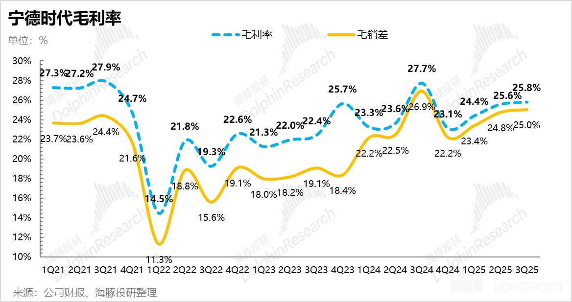 3)整体毛利率端表现不错,环比略有上行:单瓦利润改善,对应着宁王三季度的毛利率再次小幅改善。上季度的 25.6%,提升到了 25.8%,在周期向上之际,宁王毛利率缓步上行。