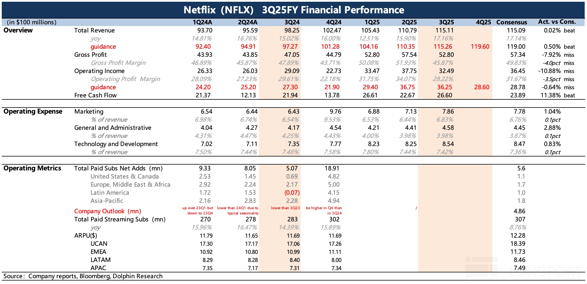 三季度是 1P 广告系统在 12 个核心地区上线后,首次运行完整季度的时期,但该自研系统可能还需要通过收集回测数据进行调优。另外,关税带来的宏观环境动荡对高单价的奈飞广告不利。不过公司对今年广告收入目标暂时不变,仍为翻倍增长,Q4 将引入亚马逊 DSP 系统。结合市场预期,我们预计今年广告收入为 15 亿左右。