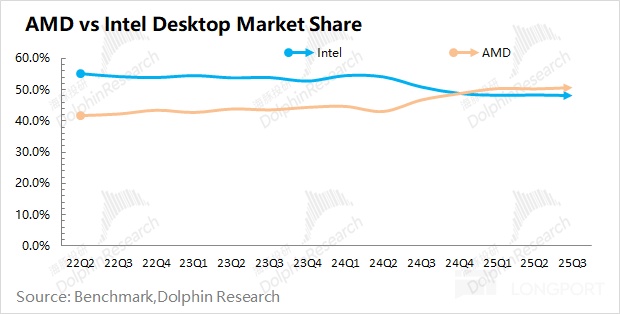英特尔经营面的 “低迷”,主要是公司处于 “看不到希望,还被偷家” 的局面:一方面,公司固守在传统数据中心 CPU 领域,而迟迟未能打开 AI 芯片的局面;另一方面,公司原本的优势领域(PC CPU 市场)还持续受到 AMD 的冲击,尤其是在桌面级 CPU 市场中,AMD 的市场份额实现了对英特尔的反超。