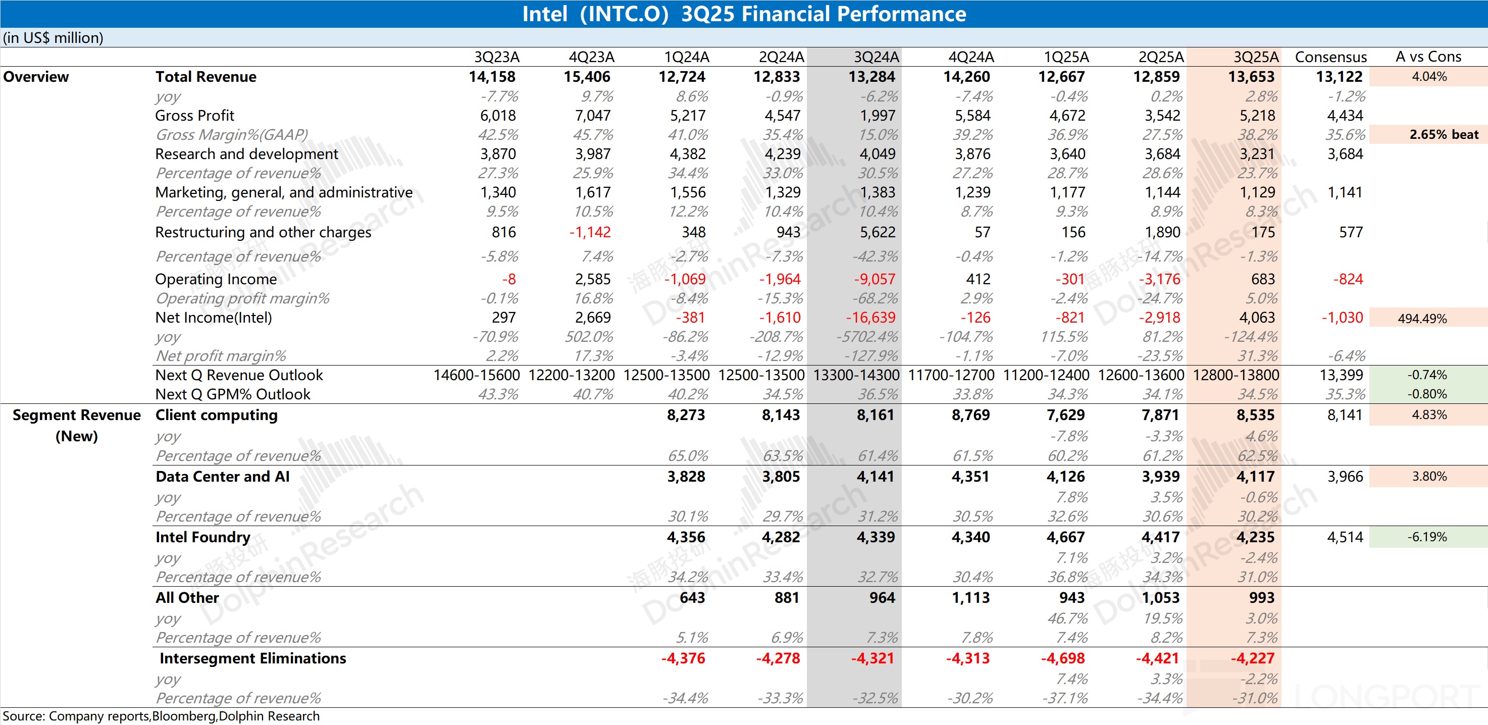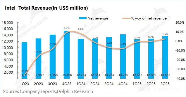 1.1 收入端:英特尔在 2025 年第三季度实现营收 136.5 亿美元,同比增长 2.8%,超出公司指引区间(126-136 亿美元)。