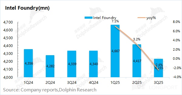英特尔的晶圆代工业务收入在 2025 年第三季度实现 42.4 亿美元,同比下滑 2.4%。结合公司本季度的各业务内部的抵消总额也有 42.3 亿美元,可以看出公司当前的晶圆代工基本都是对内服务,对外代工收入极少。