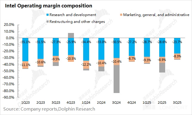 1.3 经营费用端:英特尔在 2025 年第三季度经营费用为 45.4 亿美元,同比下滑 59%。公司新任 CEO 定下 “削减成本开支” 的目标后,经营费用也是一个关注点。