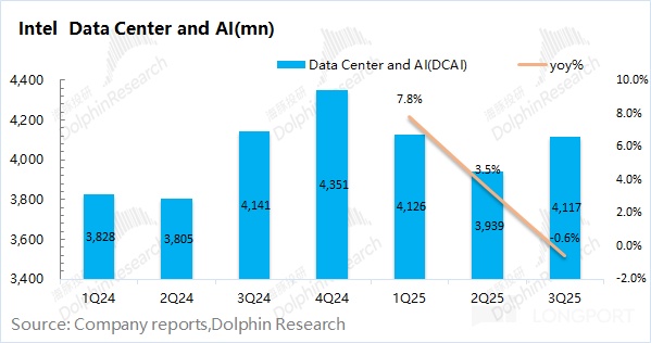 英特尔的数据中心及 AI 收入在 2025 年第三季度实现 41.2 亿美元,同比下滑 0.6%。其中环比增长,得益于 AI 服务器相关需求的带动。但整体看,公司的数据中心及 AI 收入依然维持在 40 亿美元附近,相对平淡。