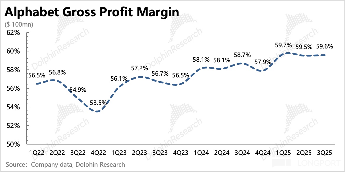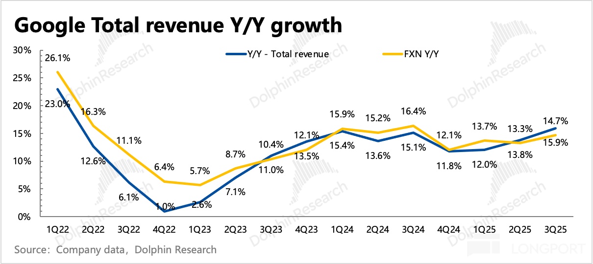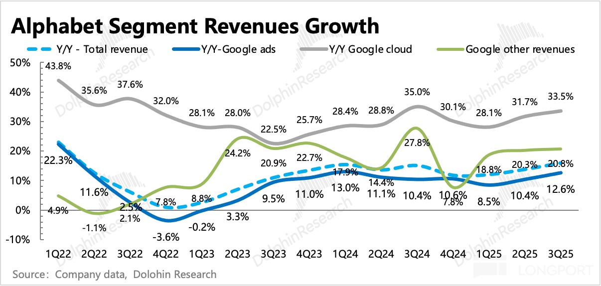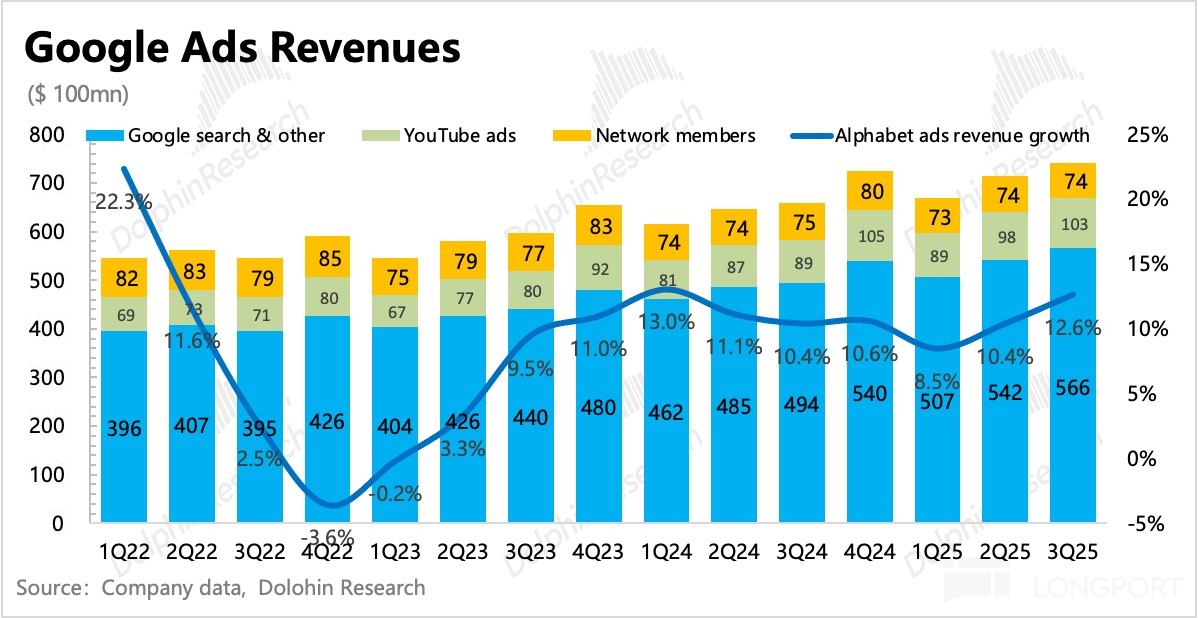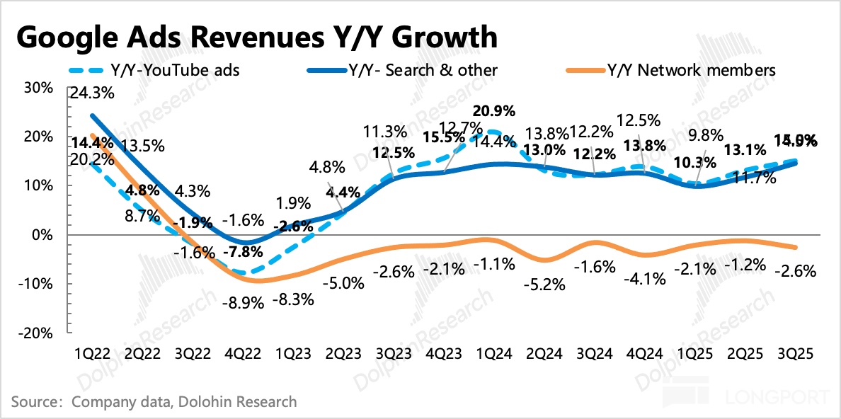 (2)意外的是搜索,不仅没有在高基数上放缓,并且还更快加速,这就更谈不上是否有 AI 侵蚀的问题了。从调研来看,增长驱动主要来自于AI Overviews、AI Mode 对搜索查询量的提升,从而带动展示量的增加。