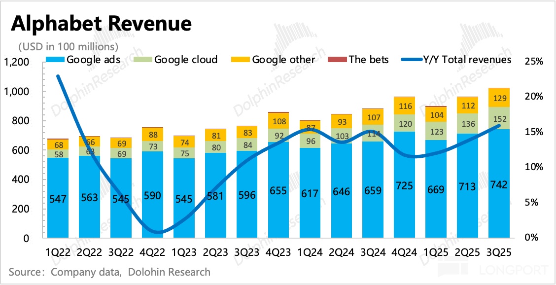 三季度广告收入 742 亿美元,整体增长 12.6%。核心的搜索、YouTube 均达到 15% 的增速,包括因美元贬值在欧洲市场的顺风。三季度暂时走出关税阴霾,继续恢复投放需求。