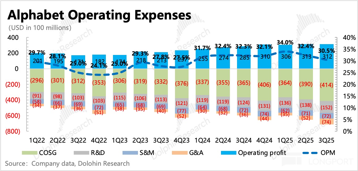 不过盈利能力优化,主要靠的是收入端的扩张。实际支出的绝对值上,还是增长的。其中销售费用负增长,管理费用剔除罚款也是同比持平,主要新增就是来自研发费用。三季度集团员工规模净新增了 3064 人,但后续大厂对传统业务优化裁员还是主要方向。年初谷歌就颁布了自愿离职方案,后续应该还是保持进出稳态区间(优化传统业务,新增 AI 等新业务),而非趋势性的扩张。