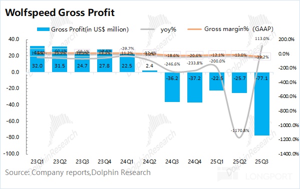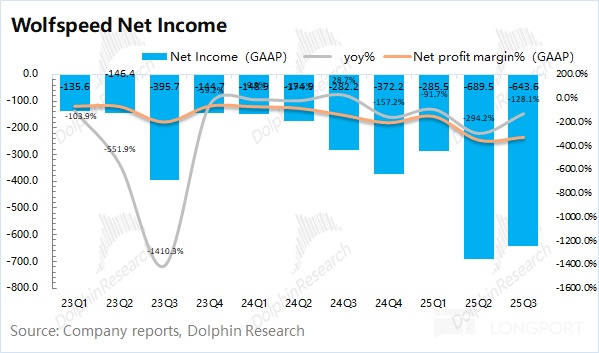 3、净利润:Wolfspeed 在 2026 财年第一季度(即 25Q3)实现净利润(GAAP)为亏损 6.44 亿美元,近两季度的亏损都在 6 亿美元以上。
