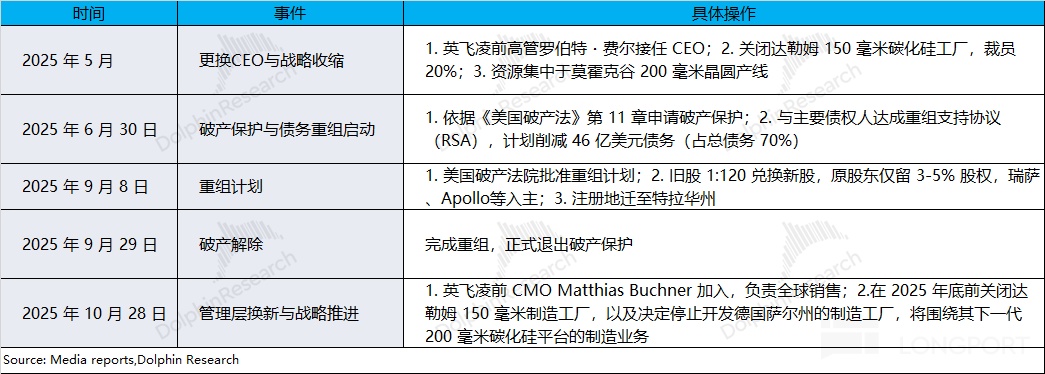 Step 3:破产解除,战略推进。在公司完成重组后,成功将总债务削减了约 70%,债务到期日延长至 2030 年,年度现金利息支出也随之降低了约 60%,并正式退出破产程序。公司任命 Matthias Buchner(前英飞凌营销高级副总裁)为全球销售高级副总裁兼首席营销官,公司将继续推进碳化硅业务。