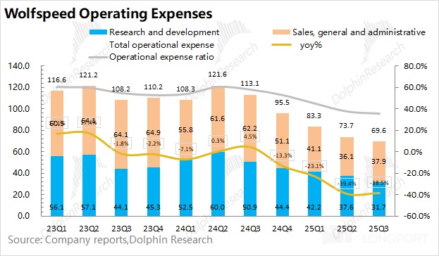 2、经营费用:Wolfspeed 在 2026 财年第一季度(即 25Q3)的核心经营费用为 0.7 亿美元,同比下滑 38.4%。从 2025 财年开始,公司已经着手裁员、降费的操作,公司研发费用和销售及管理费用都出现明显下滑,其中关闭达勒姆 150mm 工厂将大约削减 1000 人。由于公司营收端未见增长,公司当前核心经营费用率仍有 35.4%。