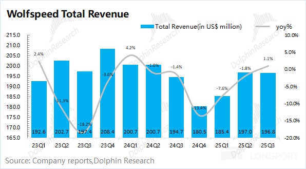 1、核心指标:Wolfspeed 在 2026 财年第一季度(即 25Q3)实现营收 1.97 亿美元,同比增长 1.1%,主要是受汽车市场需求放缓、工业&能源领域客户库存较高的影响。
