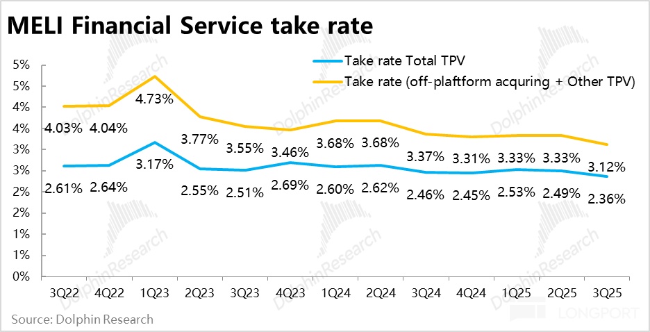 而从并不算高的电商服务收入增速,也可看出本季 Meli 电商平台业务的变现率并无多少提升。按海豚的测算本季为 20.8%,环比略微走低,同比提升幅度也仅剩 0.9pct,是近 3 年来的最低水平。反应了物流变现率的下降。