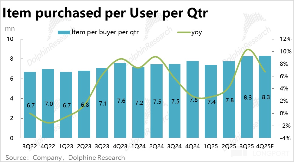 此外,公司本季的活跃买家量同比增长了 26.3%,自 1Q24 以来连续 7 个季度,用户量增速持续环比提升。平均单活跃买家季度内购物件数同比增长 10.3%,也是 22 年以来的历史新高。