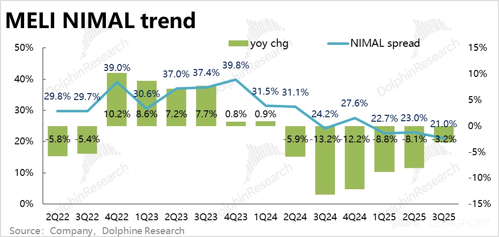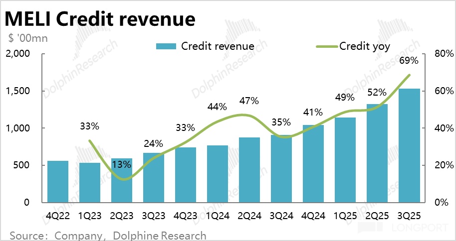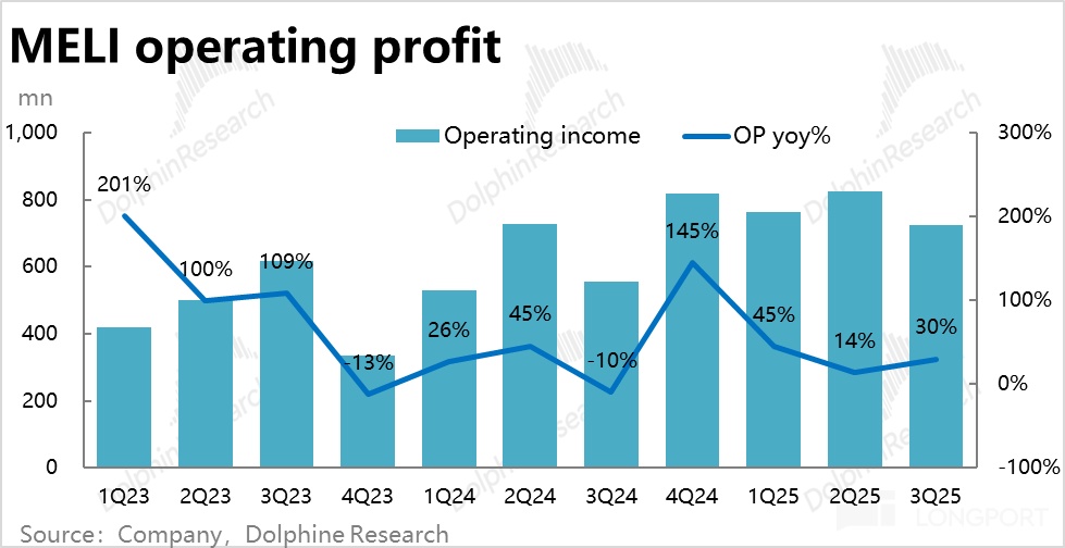 由于电商板块在更低物流成本的刺激下,GMV 和收入加速增长;金融板块内的支付也稳中有升,信贷业务增长则更加强劲,因此本季 Meli 整体营收增长了近 40% 到 74.1 亿,环比大幅提速近 6pct,好于彭博一致预期。增长端的表现可以说是相当亮眼的。