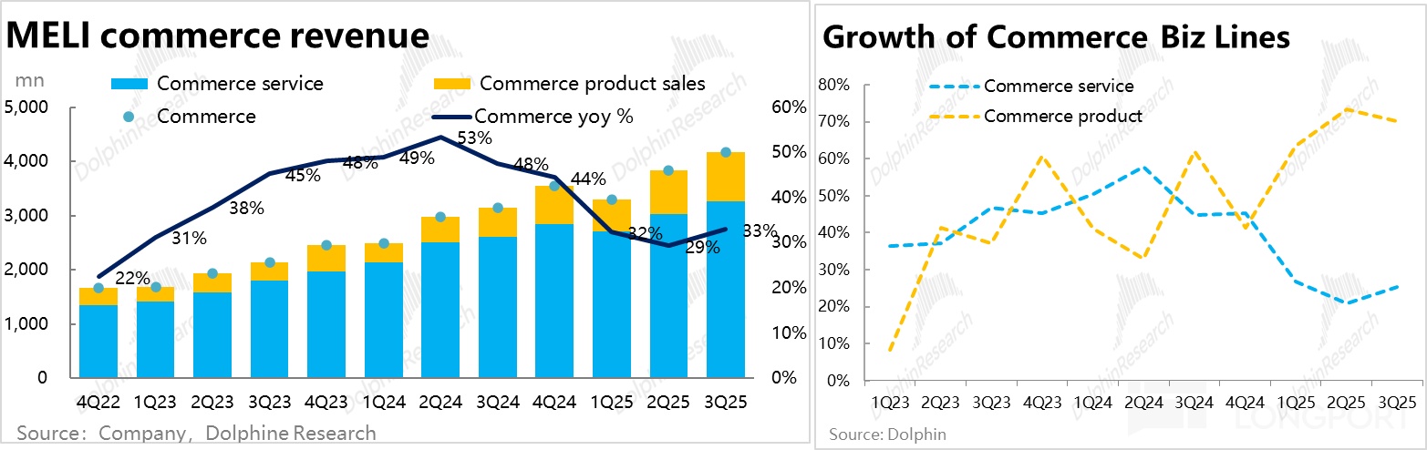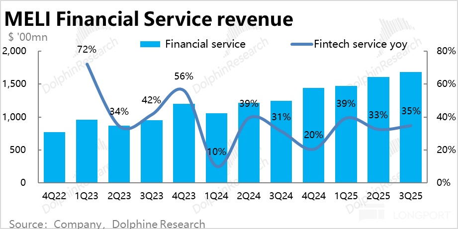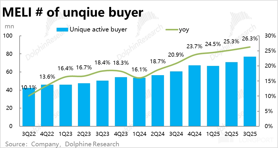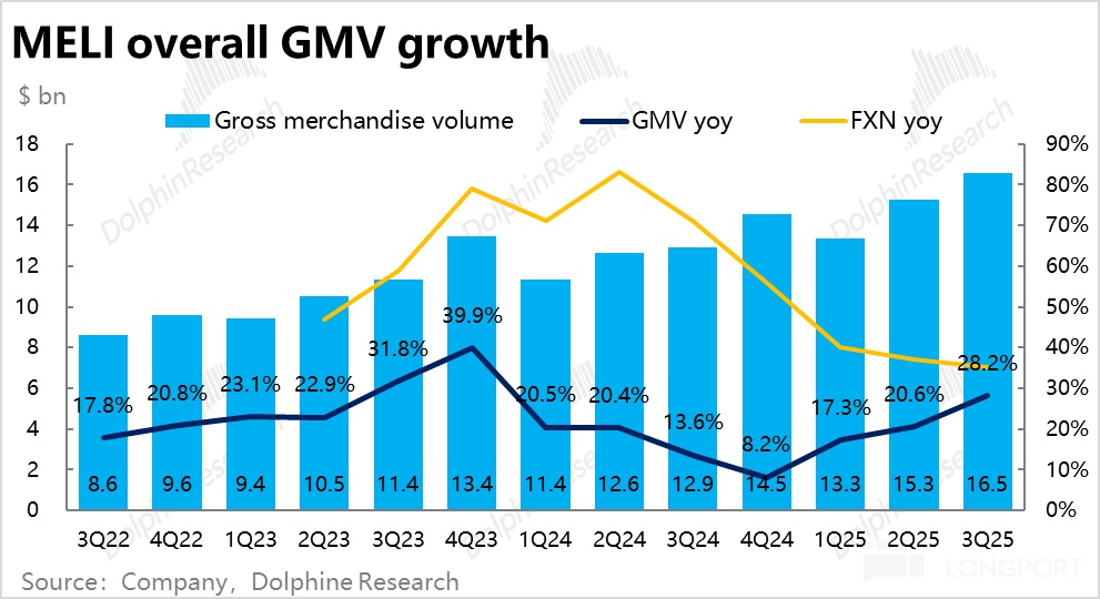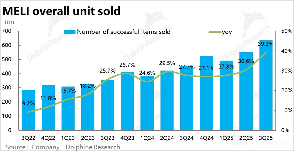 公司基石的电商业务上,本季Meli 整体 GMV 在美元口径下同比增速为 28%,相比上季明显提速(上季不到 21%),小超市场预期的 25.3%。而在本地货币口径下,公司整体 GMV 增速为 35%,相比上季反而是降速近 2pct。同时,本季订单量同比增速达 39%,较上季提速了约 8.7pct,大超市场预期。