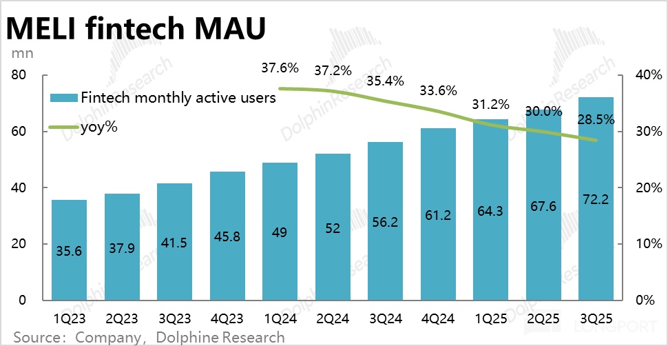 Meli 金融板块的第一指标,金融月度活跃数量本季达 7220 万人,同比增长 28.5%,相比前几个季度平稳放缓。金融板块强劲的用户量和粘度提升看起来并没有传导到金融板块的用户增长上。
