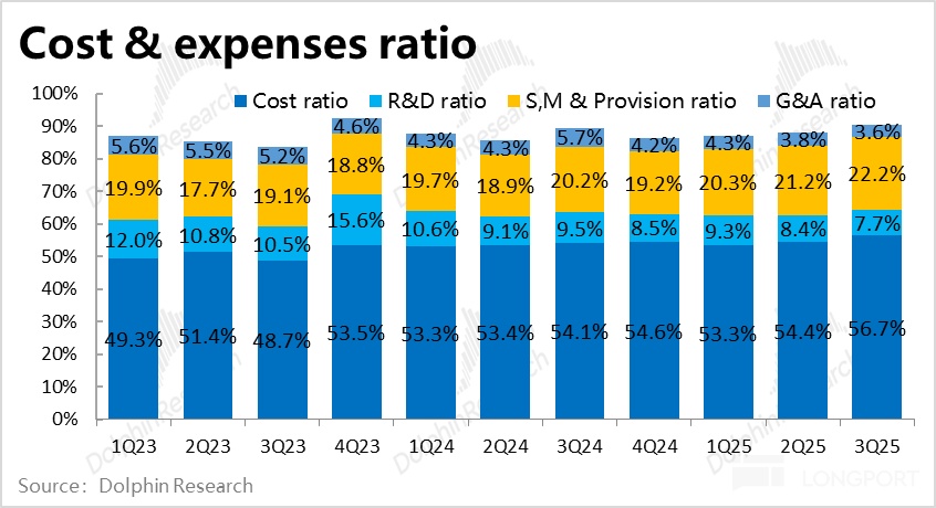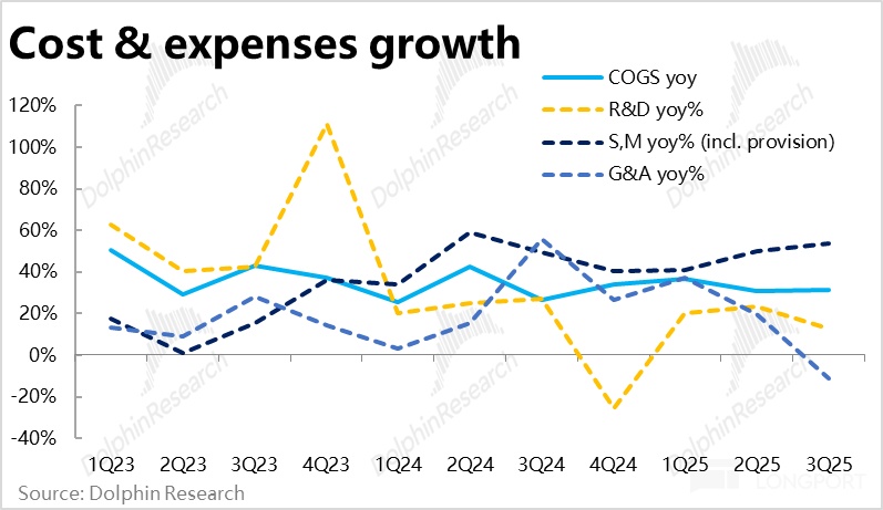 费用角度,四项经营费用合计同比增长 32%,低于收入约 40% 的增速,和毛利润增速大体相当。因此,实际上本季的费用率(占收入比重)同比反而是收缩了约 1.9pct 的。