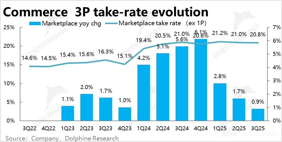 3、但补贴下,电商变现率提升幅度收窄:电商板块本季的总收入近$42 亿,同比增长 33%(如非特别强调,增速一般都是指美元口径下),也较上季提速 4pct。不过详细来看,主要是自营收入增速较高超过 70%;而 3P 平台收入是仅同比增长了约 25%。