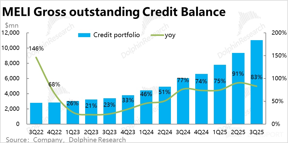 金融板块内更重要的信贷业务上,底层指标--总信贷余额本季达到$110 亿,同比增长 83%,虽相比上季略有降速,但仍维持在很高的绝对增速上,也明显跑赢彭博一致预期。