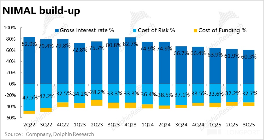 NIMAL 的另一重要组成部分 -- Cost of Risk(即坏账计提损失占平均贷款余额的比重),本季度为-32.7%,环比小幅走高。结合上述两个主要影响因素。本季 NIMAL(剔除坏账损失后净利息率—即体现公司信贷业务利润率的指标)环比收窄了约 2pct。
