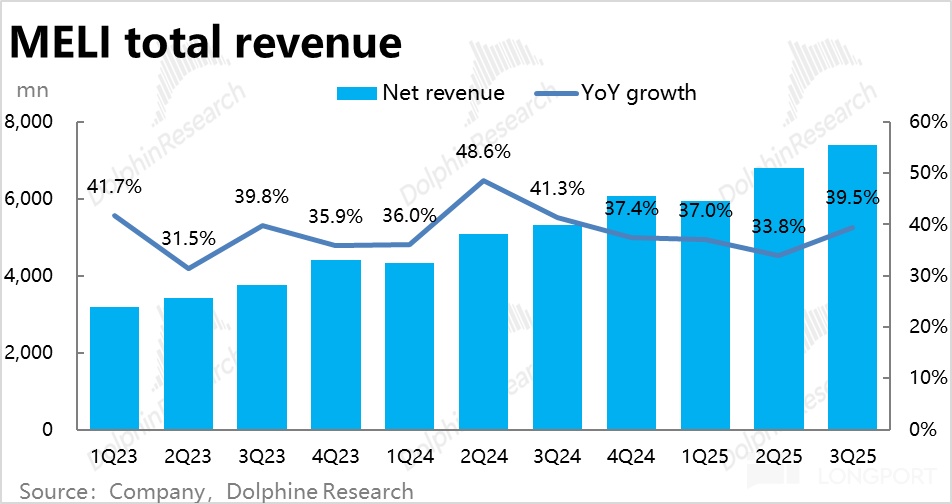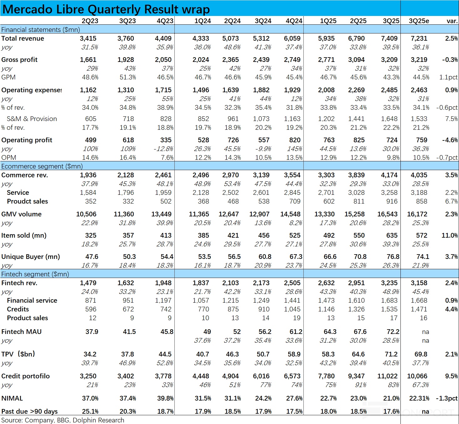 拉美版 “阿里”—$拉美商业服务(MELI.US)(后文简称 Meli)于 10 月 30 日,发布了 2025 年 3 季度的财报。整体来看,收入端表现不错,环比加速增长且小超预期。相对的,因电商板块内物流补贴增加,金融业务也因结构性因素变现/利息率有所下降,导致利润率下滑,跑输卖方预期。