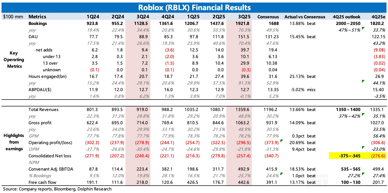 $罗布乐思(RBLX.US) 美东时间 10 月 30 日美股盘前发布了 2025 财年第三季度业绩。整体业绩全面超预期,但市场可能不满的是,四季度亏损超预期和指引隐含的增长趋势(放缓过快)。