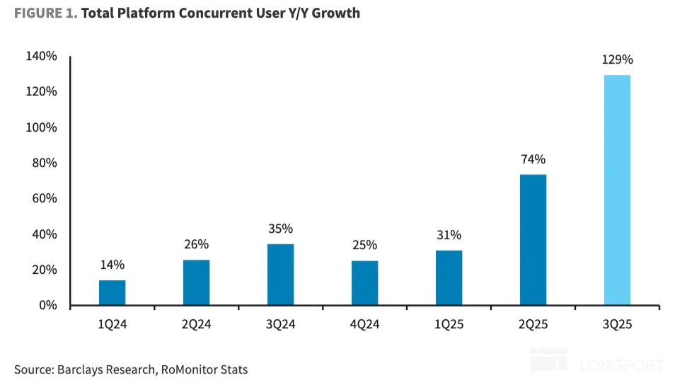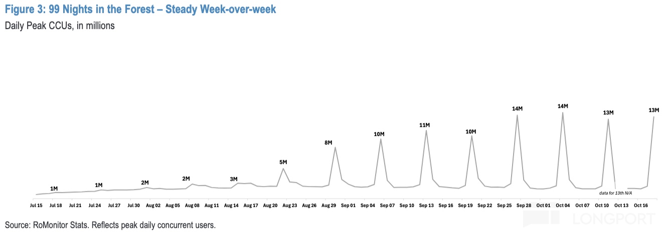 1、受益热门游戏,三季度平台流水、DAU 均同比增长 70%,显著超出公司保守指引。虽然实际表现也超过卖方一致预期,但考虑到三季度平台同时在线人数同比增加 130%,按照在线人数与 Bookings 变化趋势来看,三季度大大超指引(+40%)概率非常高,因此海豚君判断,买方情绪会比一致预期要积极得多。