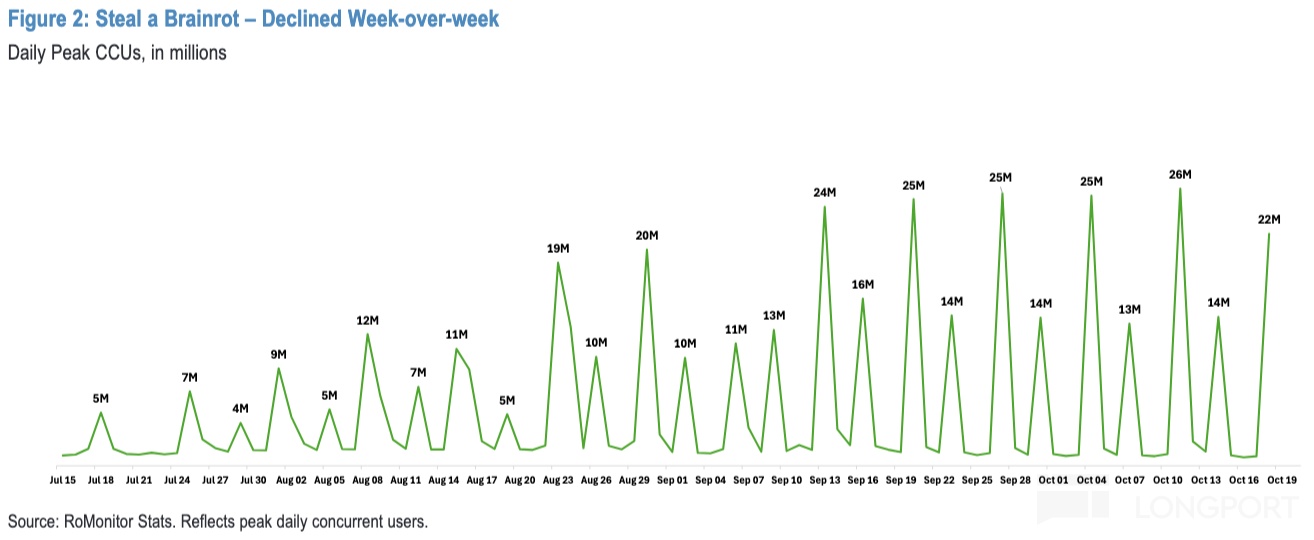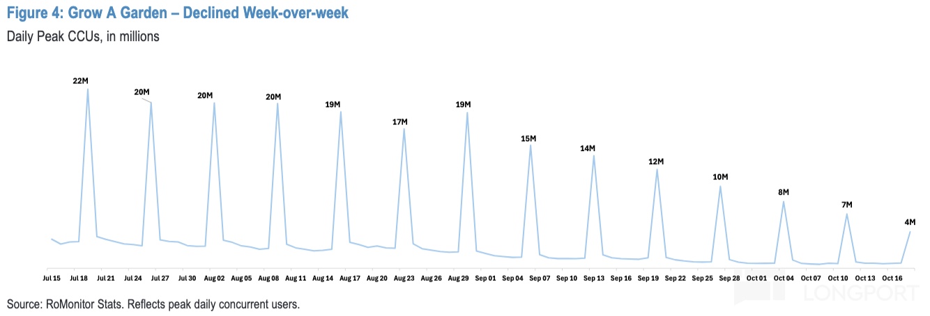 Q2 超预期业绩发布至今,Roblox 的股价实际没怎么涨。这其中的主要影响因素,就是二季度的爆款游戏《Grow a Garden》在进入 8 月之后用户参与显著放缓,Roblox 也因此而回调了 15%。当另一新爆款《Steal a Brainrot》用了更快的速度接棒《Grow a Garden》的用户流量,股价才重新修复。
