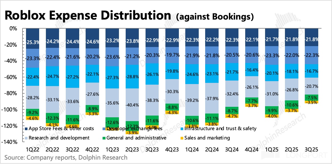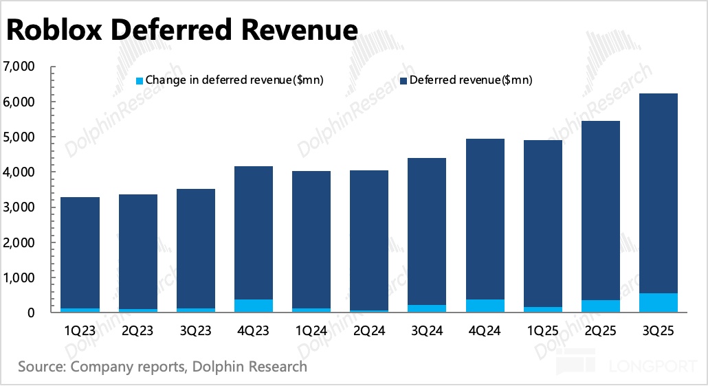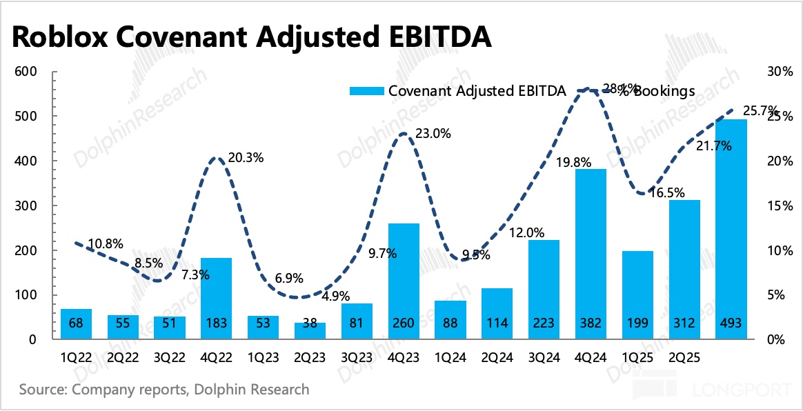 实际来看,三季度 GAAP 经营亏损近 3 亿,亏损率收窄至 22%,剔除 SBC、利息、折旧摊销后的 Non-GAAP EBITDA 为 0.46 亿,利润率 2.4%。但由于 Roblox 待确认的递延收入很高,考虑这部分收入后,Covenant Adj. EBITDA 利润率则环比提升 4pct 到到 26%,也更能体现真实经营状况。