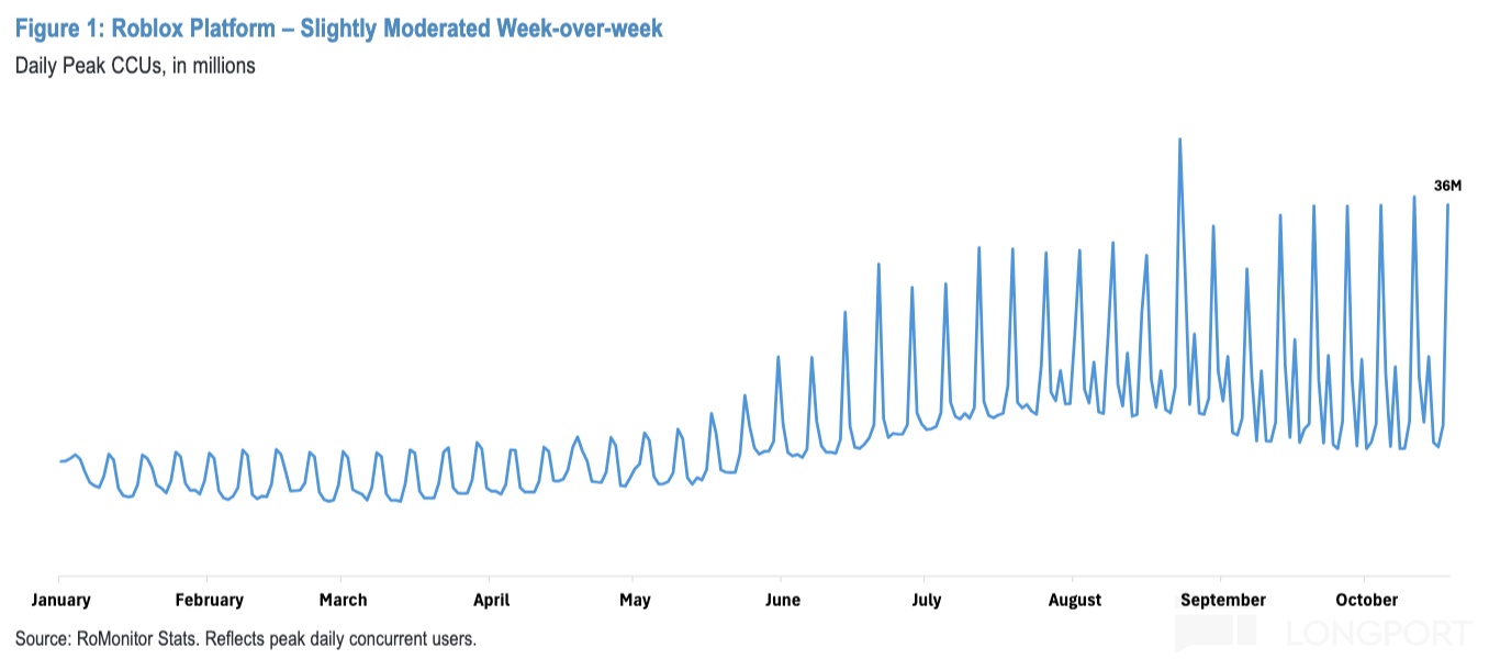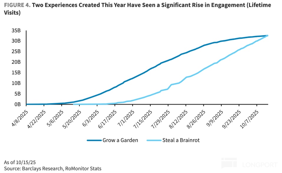 因此《Grow a Garden》之后是《Steal a Brainrot》,《Steal a Brainrot》还未完全衰减,后面又来了《99 Nights in the Forest》,随后又是《Plants Vs. Brainrots》。虽然后两者爆发性不如《Steal a Brainrot》,但这种接棒的趋势印证了 Roblox 的内循环生态逐步稳固——这使得,纵使游戏之间此消彼长,但平台整体处于扩张趋势。