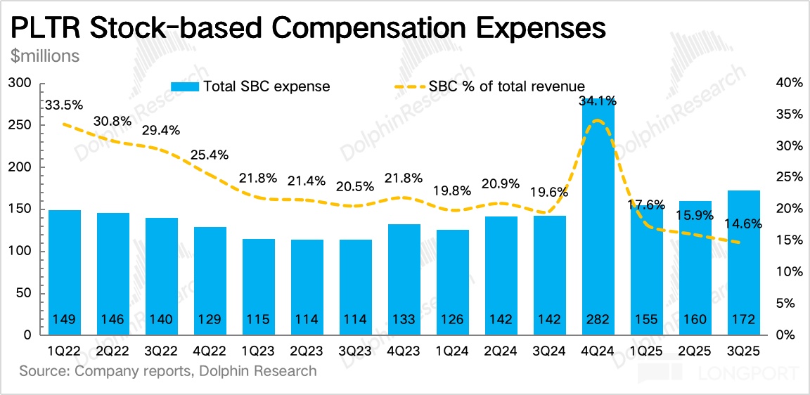 三季度 Palantir 实现 GAAP 下经营利润 3.93 亿,三项经营费用继续维持在 20% 左右的同比增长,低于收入增速,因此利润率提升。SBC 增幅不高,但相比收入占比继续下滑。考虑到同期市值上涨了 30%,因此可能在同步进行员工优化。