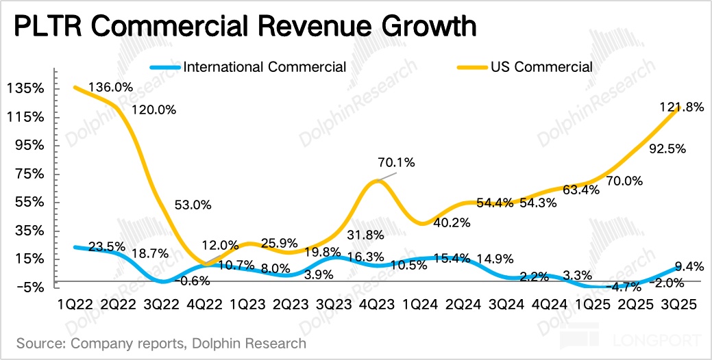 1. 美企需求还没到头:政府收入被视作 Palantir 的护城河,但高估值对应的高增长预期,则靠的是美国商业收入。三季度整体商业收入继续加速增长,而美国本地企业的需求,再次将增速拉高到 122%,还未看到见顶风险。