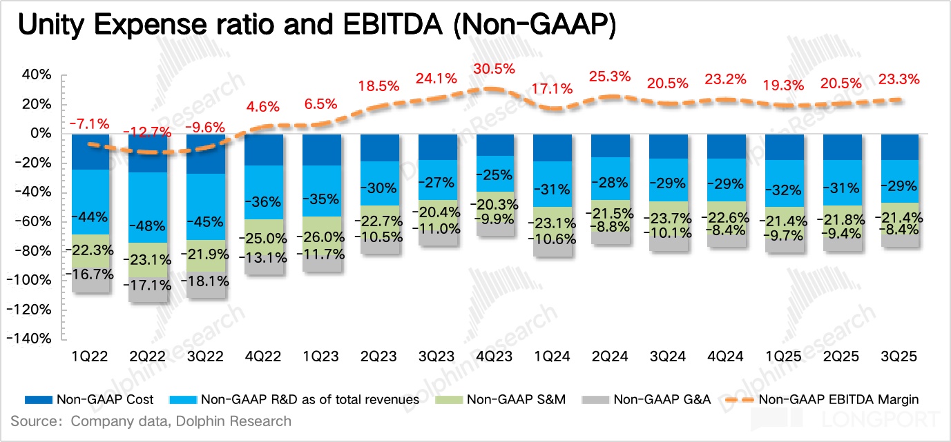 值得一提的是,GAAP 下研发费用增幅明显,主要源于对当时收购 Weta(已经剥离)时获得的技术资产加速摊销。由原来的 4-7 年缩短至 1-3 年,才使得三季度当期费用高增。不过公司和市场对当下的 Unity 还处于看 Non-GAAP EBITDA 的阶段,因此不影响实际预期。