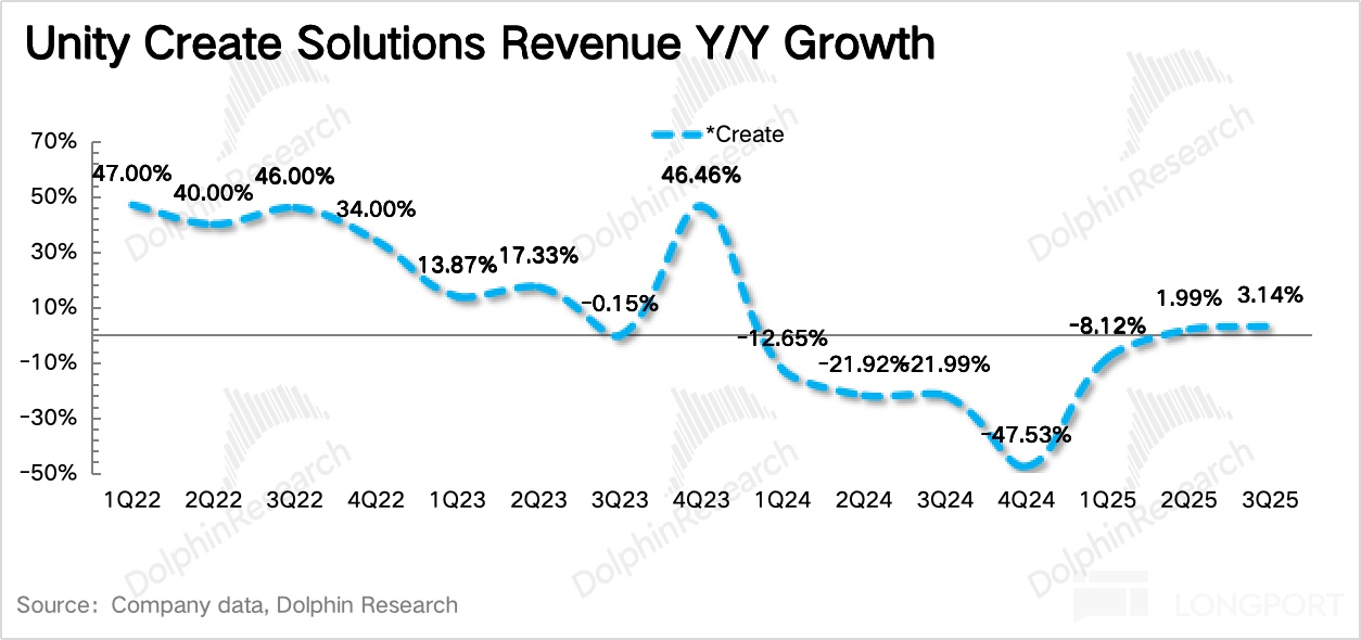 2. Unity 6 推动增长:Create 三季度同比增长 3%,但环比下降。上季度有一笔 1200 万的大额授权费在前期确认(腾讯、Scopely),因此如果剔除这个特殊扰动,那么环比增长 7%,可以看到明显的改善迹象。Q4 指引是高个位数百分比增长,大约 7-8% 左右,环比看也有 8% 的增速。