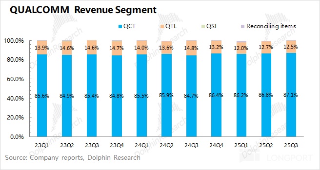 高通在 2025 财年第四季度(即 25Q3)实现营收 112.7 亿美元,同比上升 10%,好于市场预期(107.5 亿美元)。其中 QCT(半导体芯片业务)中智能手机、汽车及 IoT 业务的增长带动,而 QTL(技术许可业务)同比有所下滑。