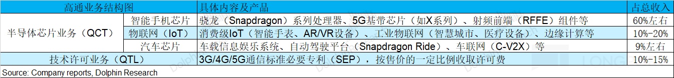 2、具体业务情况:$高通(QCOM.US) 的业务主要分为半导体芯片业务(QCT)和技术许可业务(QTL)两部分,其中半导体芯片业务是公司最大收入来源,占比接近 9 成。