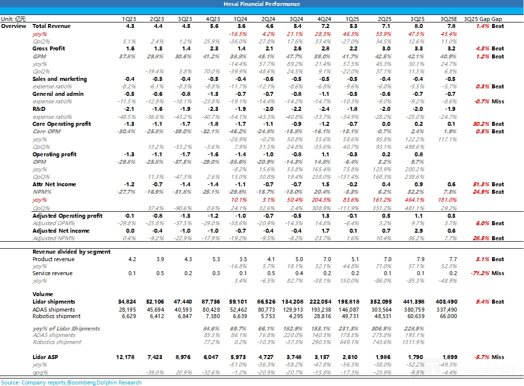 1)收入端仍然维持同比高增趋势,激光雷达仍然还在持续放量:三季度收入 8 亿元,继续保持同比 47.5% 的高增趋势,同样也要超市场预期 7.8 亿元,而本季度收入端超预期的关键主要在于激光雷达的出货量大幅超出市场预期,仍然主要由禾赛的低价 ATX 乘用车雷达的加速出货所带动。