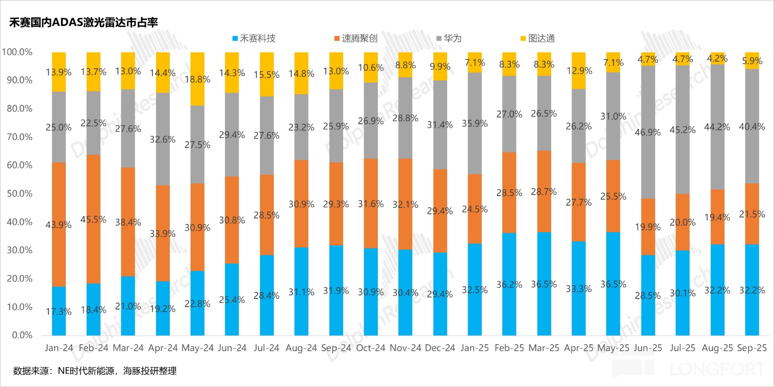 从市占率来看,虽然禾赛自 6 月开始市占率有所下滑,主要受到华为的市占率提升影响(华为补盲激光雷达的放量以及新款问界 M8 的爬坡贡献),但华为的激光雷达由于价格昂贵且以软硬一体化形式打包出货,所以主要客户仍是智选车和 HI 模式下客户,所以实际的竞争仍集中在禾赛,速腾和图达通三家的竞争。