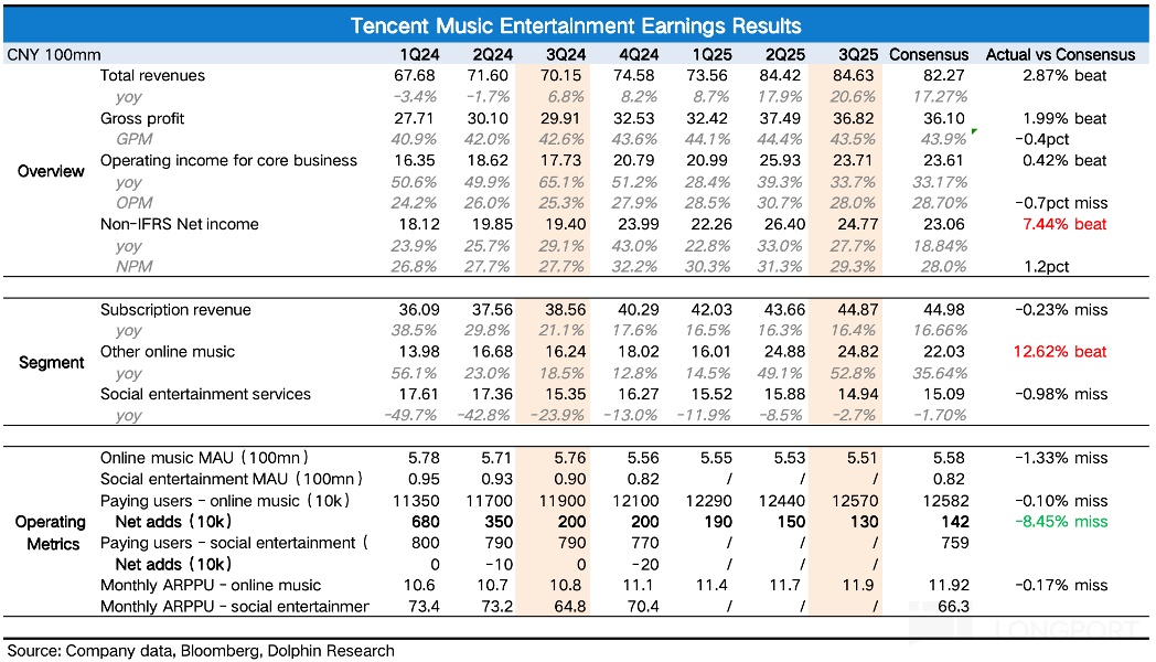 1. 腾讯音乐娱乐集团(TME)2025 年第三季度总收入同比增长 21% 至 85 亿元人民币,创 2021 年第一季度以来最高增速。这得益于音乐订阅业务持续增长,线下演出、广告服务及艺人周边商品销售的强劲表现。