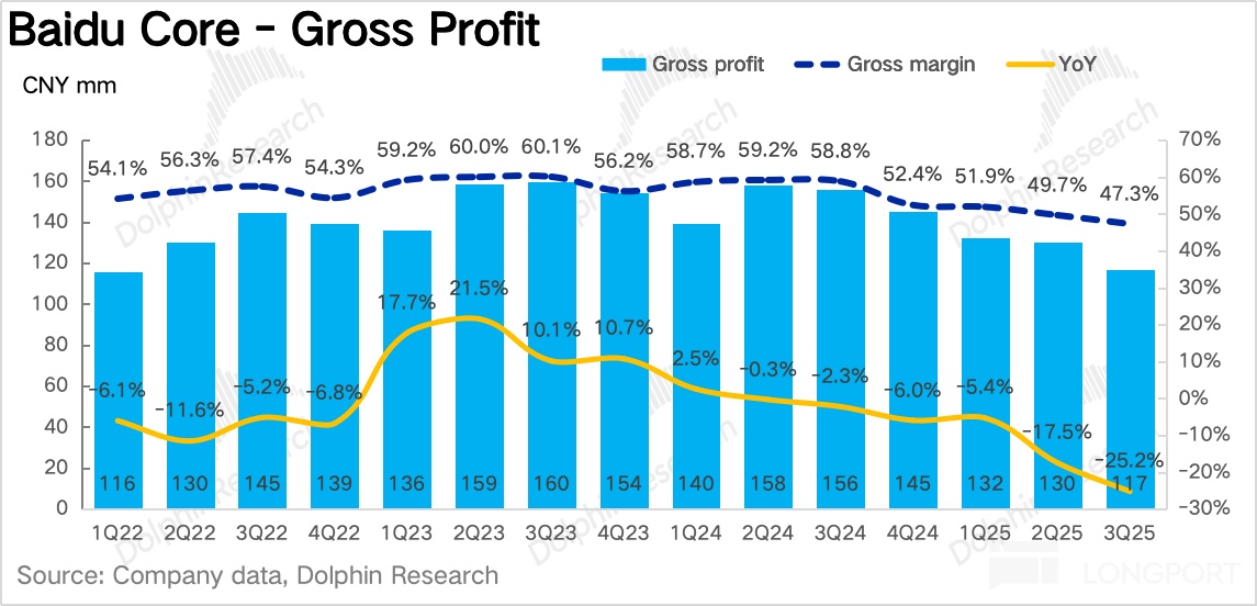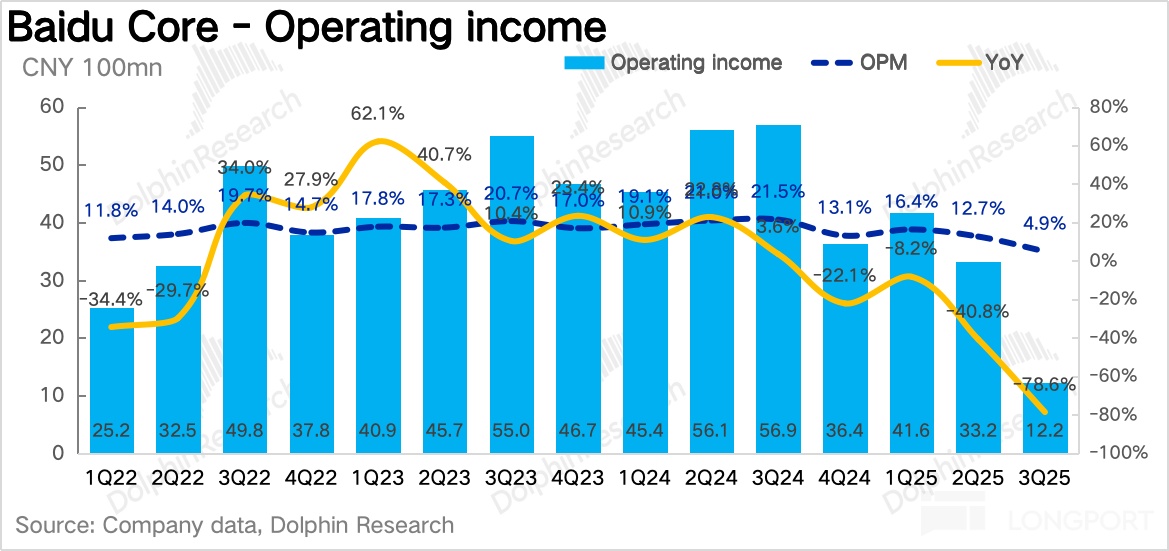 从用户数也能看出问题,三季度手百用户 MAU 环比净减少 2700 万用户,虽然比去年同期的情况略好一些,但年初起通过融合 AI 搜索后的产品体验提升,这个积极效应正在减弱,也变相透出一些流量迁移的迹象。