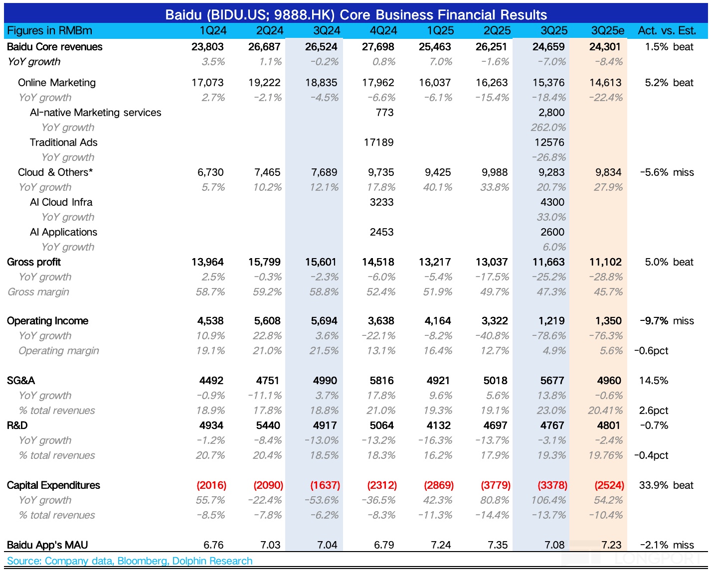 $百度(BIDU.US) 三季度业绩于 2025 年 11 月 18 日港股盘后放出,整体看符合预期,通过详细披露 AI 收入的动作,看的出来公司急切想撕掉传统标签、全面开讲 AI 新故事的决心。